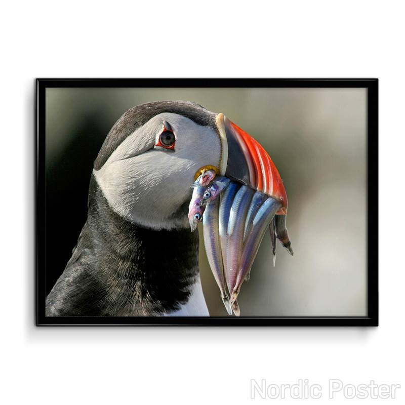 Falleg veggmynd með ljósmynd af lunda með goggfylli af síli eftir ljósmyndarann Sindra Skúlason. Myndin er 70 x 50 cm að stærð og kemur í pappahólk.