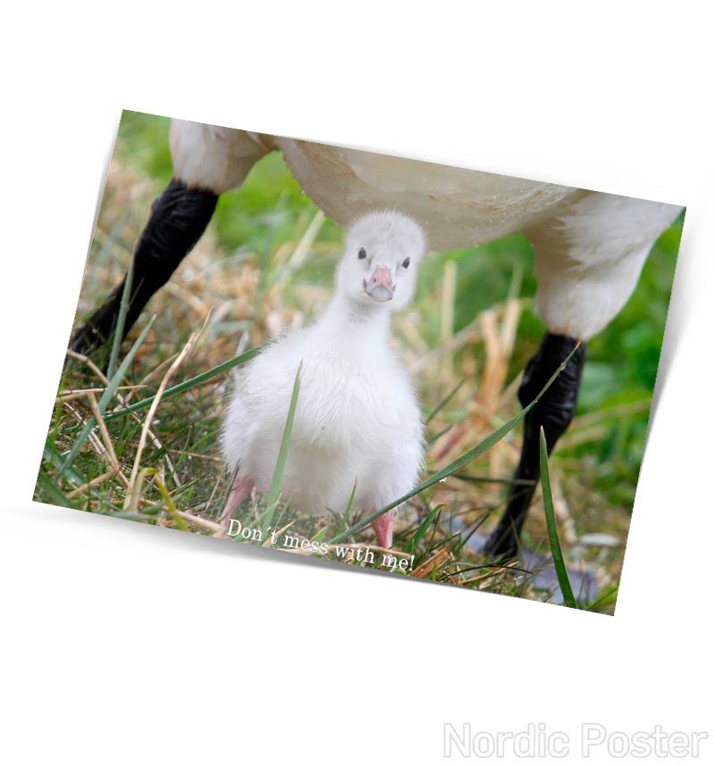 Fallegt einfalt póstkort með mynd af álftarunga og skondnum myndatexta eftir Helga Skúlason.