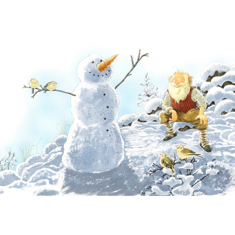 Fallegt einfalt póstkort með mynd eftir hinn þjóðkunna listamann Brian Pilkington af íslensku jólasveinunum. Hér eru þeir skellihlæjandi yfir frekar mislukkuðum snjókarli.