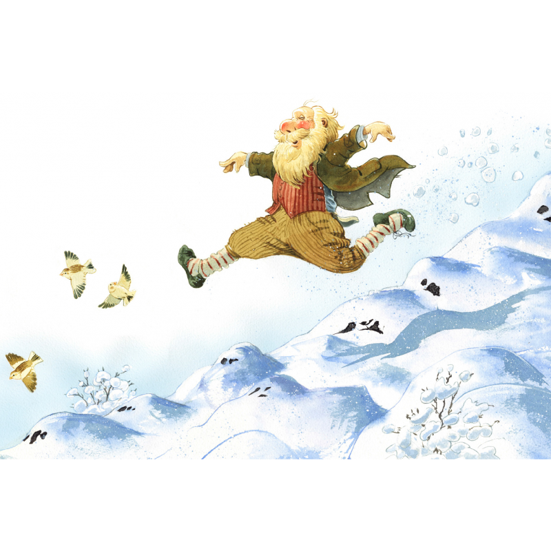 Fallegt einfalt póstkort með mynd eftir hinn þjóðkunna listamann Brian Pilkington af íslensku jólasveinunum. Hér er einn svo glaður að hann gæti næstum flogið.
