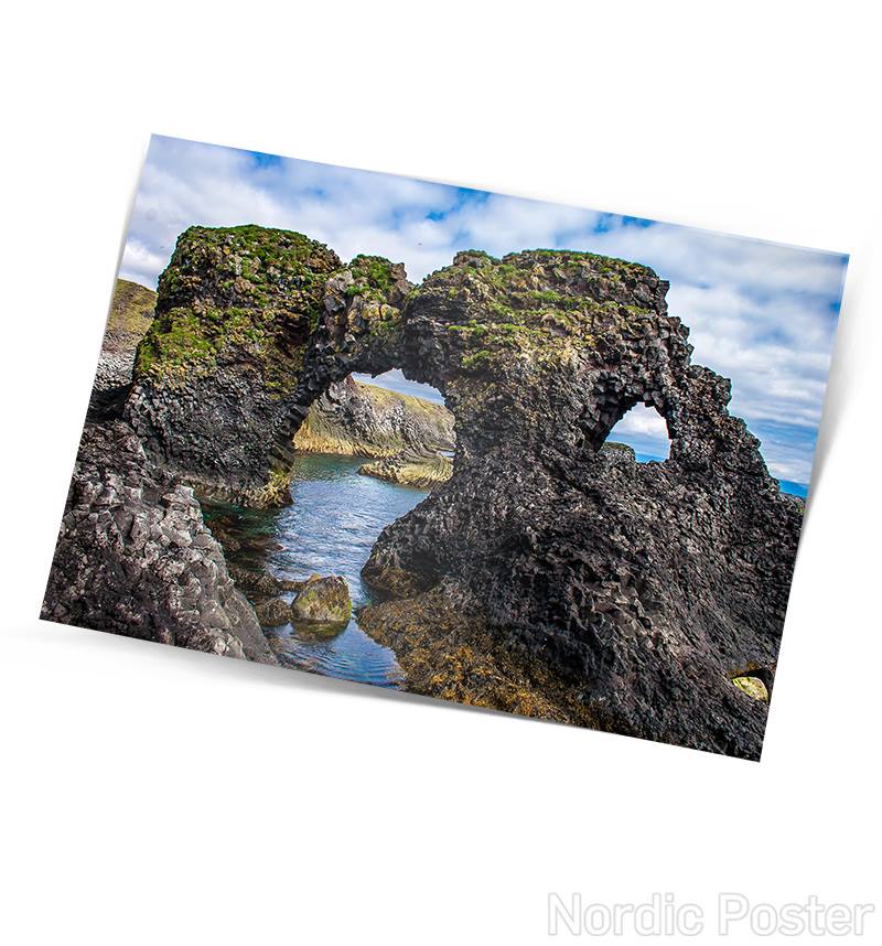 Fallegt einfalt póstkort með mynd af Gatkletti á Arnarstapa eftir Rafn Sigurbjörnsson.