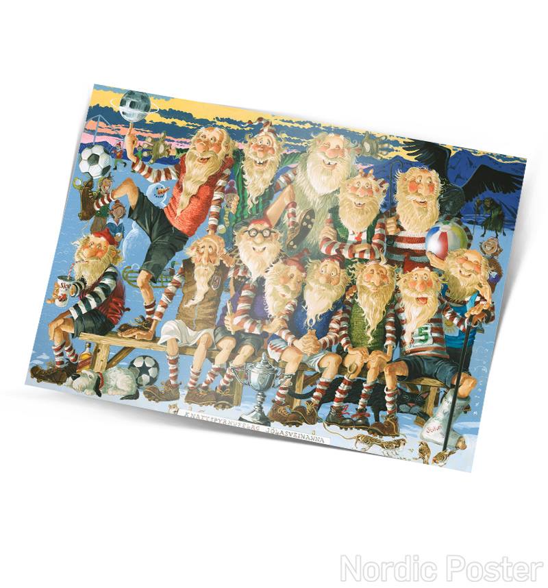 Fallegt einfalt póstkort með mynd eftir hinn þjóðkunna listamann Brian Pilkington af íslensku jólasveinunum að spila fótbolta.