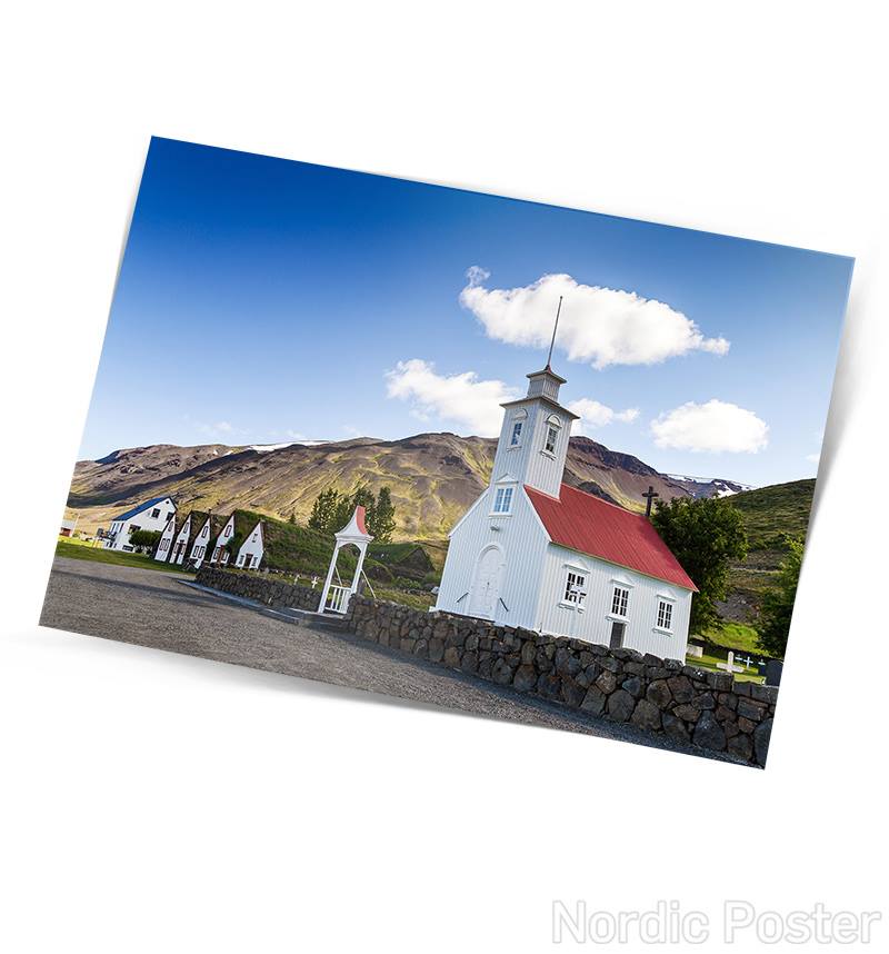 Fallegt einfalt póstkort með mynd af kirkjunni og gamla bænum í Laufási eftir Rafn Sigurbjörnsson.