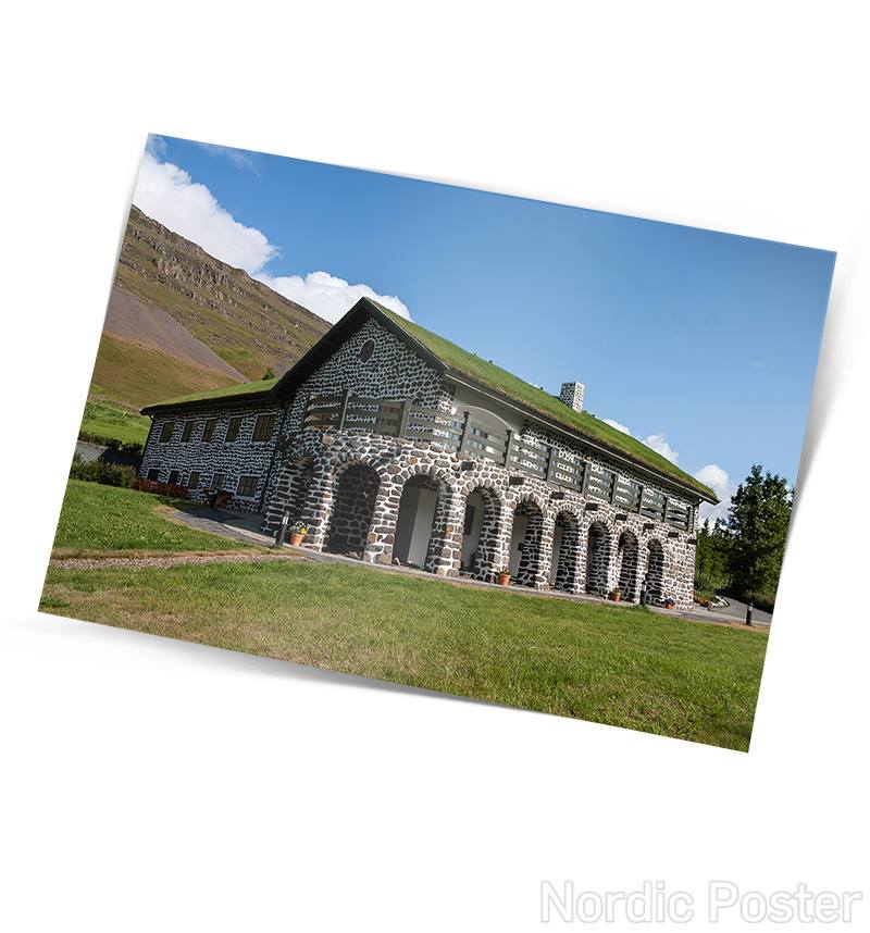 Fallegt einfalt póstkort með mynd af Gunnarshúsi á Skriðuklaustri í Fljótsdal eftir Rafn Sigurbjörnsson.