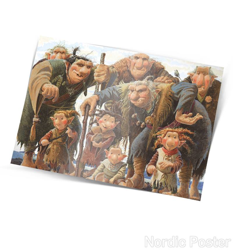 Fallegt einfalt póstkort með mynd eftir hinn þjóðkunna listamann Brian Pilkington af íslenskri tröllafjölskyldu.